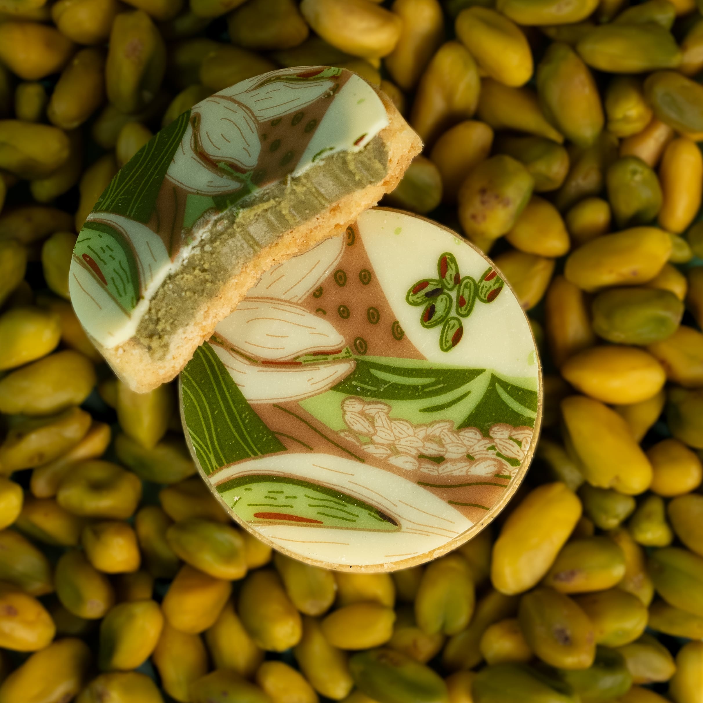 Chaque biscuit est composé d’un sablé vanillé pur beurre AOP Charentes-Poitou, un fourrage gourmand à la pâte de pistache torréfiée 100% et un disque de chocolat Valrhona® craquant.